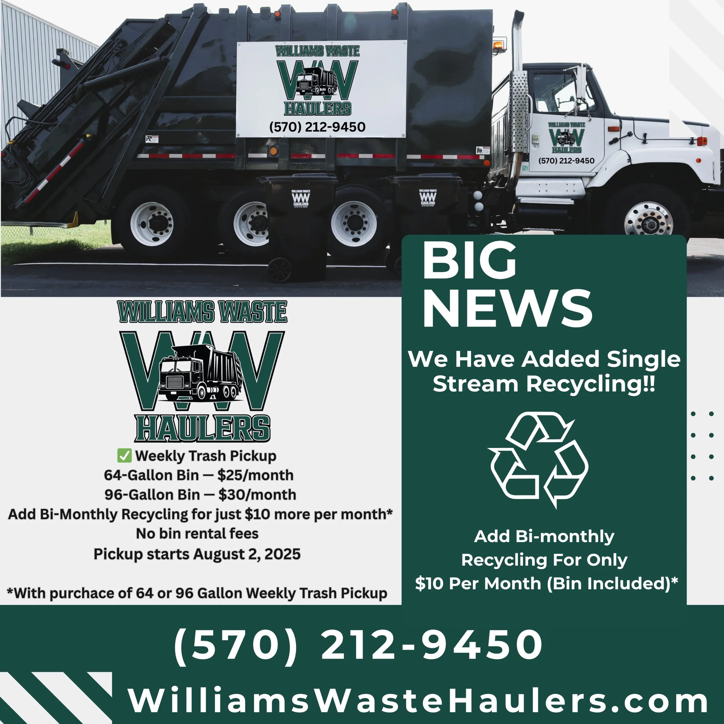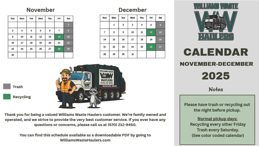 Say hello to clean streets and peace of mind with Williams Waste Haulers—your dependable partner in keeping your home and neighborhood spotless! With punctual pickups, courteous service, and a commitment to tidiness, we handle your waste so you don’t have to. No more missed collections, no more mess—just reliable, top-notch service with a smile. Call Williams Waste Haulers today and experience waste management the way it should be—neat, efficient, and worry-free!